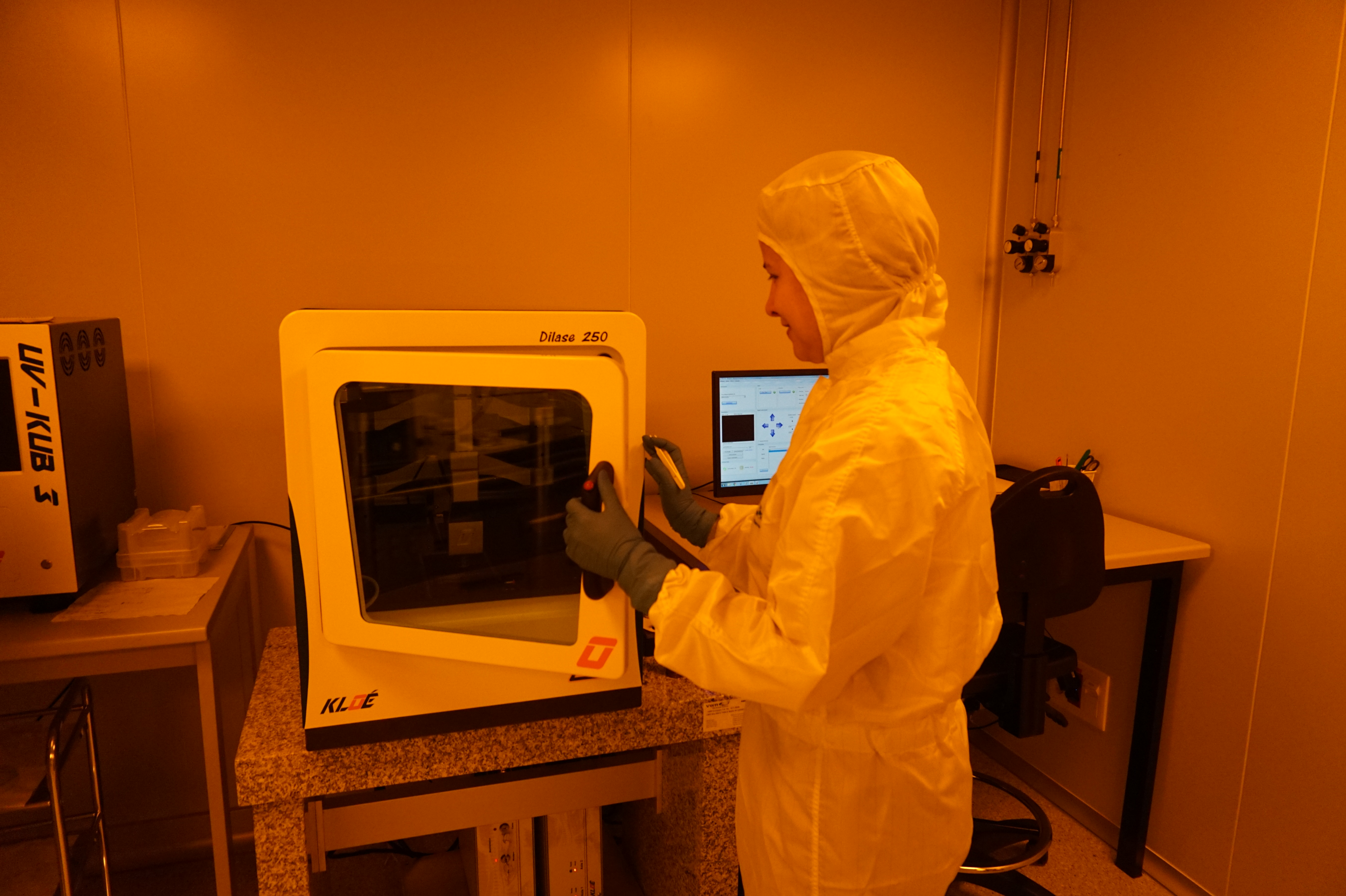 On the grown nanofabric, which appears like a continuous sheet, scientists “draw” the channels on which they want the electrons to travel. “This process is called photolithography and uses some chemicals very sensitive to light. It’s very similar to the old way to develop films, in the darkroom,” says Adriana Isabel Figueroa García, a postdoctoral researcher at ICN2. It takes place in a super clean room, where special suits and masks are needed to go enter and work in so to avoid introducing outside pollutants into the ultra-clean environment.